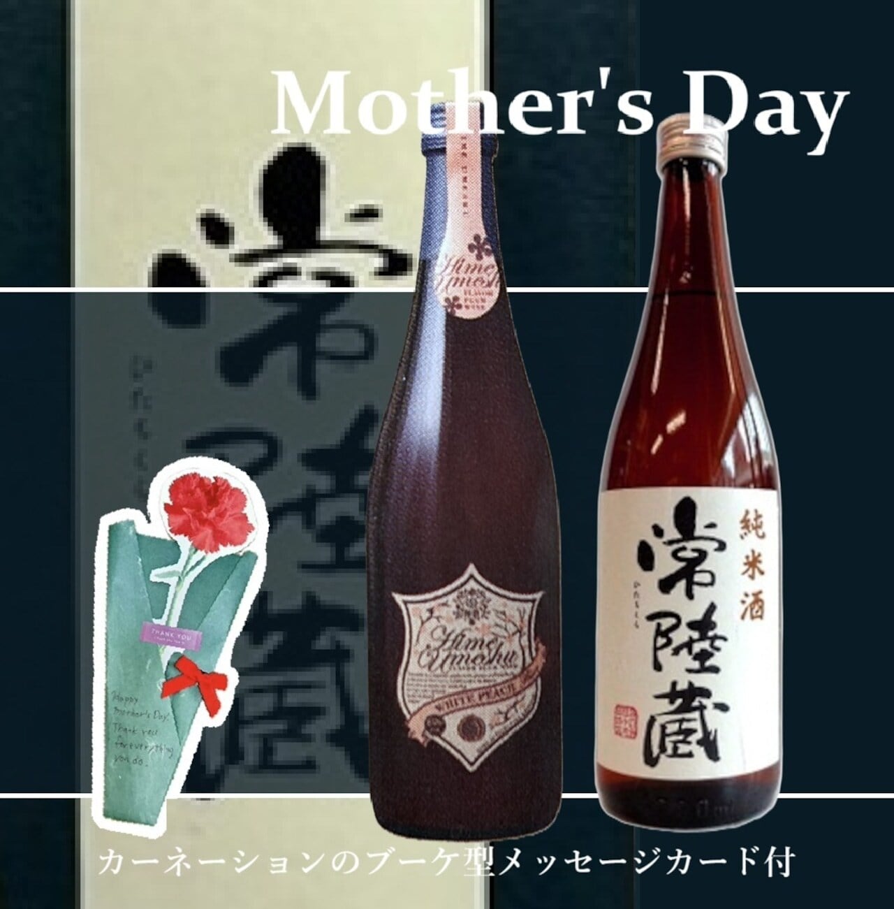 (お届け内容) 常陸蔵 純米720ml(日本酒)化粧箱入 1本 姫梅酒 白桃720ml(梅酒) 化粧箱入 1本 花束型メッセージカード 1部(写真4枚目、または5枚目、または6枚目のいずれかひとつとなります。お色の指定はご遠慮お願いいたします。)(文言:Happy Mother's Day ! Thank you for everything you do.) ※メッセージカードは数量限定です。在庫がなくなり次第、メッセージカードの添付は終了させていただきます。ご了承くださいませ。 *:.。..。.。o○*:.。..。.。o○*:.。..。.。o○*:.。..。.。o○*:.。..。.。o○*: (お届けお酒のご紹介) *:.。..。.。o○*:.。..。.。o○*:.。..。.。o○*:.。..。.。o○*:.。..。.。o○*: 常陸蔵 純米720ml(日本酒)化粧箱入 伝統の手造り技術で杜氏さんが丁寧につくったお酒です。 淡麗で飲みやすい辛口タイプ、すっきりとして、のど越しのよい、純米酒。 地元の魚介類や野菜など特に相性が良く、おいしくいただけます。 口当たりスムーズでやわらかなうまさは、幅広い料理とマッチします。 ◎お食事とともに、食中酒として。 ◎お酒を楽しみ、素敵なくつろぎタイムに。 お酒の詳細はこちら ➡ https://sake2.base.ec/items/124964985 おいしい飲み方・温度帯 ◎冷やで。(10度前後) ◎常温で。 ◎ぬるかんで。 *:.。..。.。o○*:.。..。.。o○*:.。..。.。o○*:.。..。.。o○*:.。..。.。o○*: 姫梅酒<白桃>720ml瓶 丁寧に手摘みした群馬県産「白加賀梅」を米焼酎をベースに熟成させ、天然素材の白桃フレーバーを加えました。 とろりとした口当たりの「白桃」はストレートでクリームチーズと合わせてデザート感覚で飲まれるのも美味しいです。「白桃」は女性に人気のフレーバーのひとつです。 ボトルデザインの上品さも魅力的のひとつです。 贈り物にもおすすめです。 ◎〇◎美味しい飲み方◎〇◎ 冷やしてストレートで。 氷を浮かべてロックで。 デザート感覚でバニラアイスクリームにかけて。 炭酸ソーダで割って、スパークリング梅酒で。 梅酒 / リキュール / 原材料:梅酒(国内製造)・果糖・もも果汁・香料 / アルコール度数: 15度 / 製造元:菊乃香酒造 / 内容量:720ml / 県名: 茨城県 ※実店舗にて他のフレーバーの姫梅酒も販売しております。 *:.。..。.。o○*:.。..。.。o○*:.。..。.。o○*:.。..。.。o○*:.。..。.。o○*: ※飲酒は20歳になってから ※お酒はおいしく適量を ※妊娠中・授乳期は飲酒を気をつけましょう ※飲酒運転は法律で禁止されています ※掲載商品は実店舗でも同時に販売を行っております。そのため、在庫更新によるタイムラグや同時注文などにより、発送の遅れが発生する場合や、在庫切れで販売ができなくなる可能性がございます。また、一部の商品はメーカー取り寄せとなります。万が一、店頭・メーカーともに在庫切れの際はご容赦くださいませ。 *:.。..。.。o○*:.。..。.。o○*:.。..。.。o○*:.。..。.。o○*:.。..。.。o○*: <ネット販売・通販・WEBでお買いものの酒屋> 小川屋酒店 (URL)http://sake2.base.ec/ 創業1911年の酒屋、おいしい嬉しいをお届けします。 合資会社小川屋酒店 *:.。..。.。o○*:.。..。.。o○*:.。..。.。o○*:.。..。.。o○*:.。..。.。o○*: THANK YOU!! *:.。..。.。o○*:.。..。.。o○*:.。..。.。o○*:.。..。.。o○*:.。..。.。o○*:
